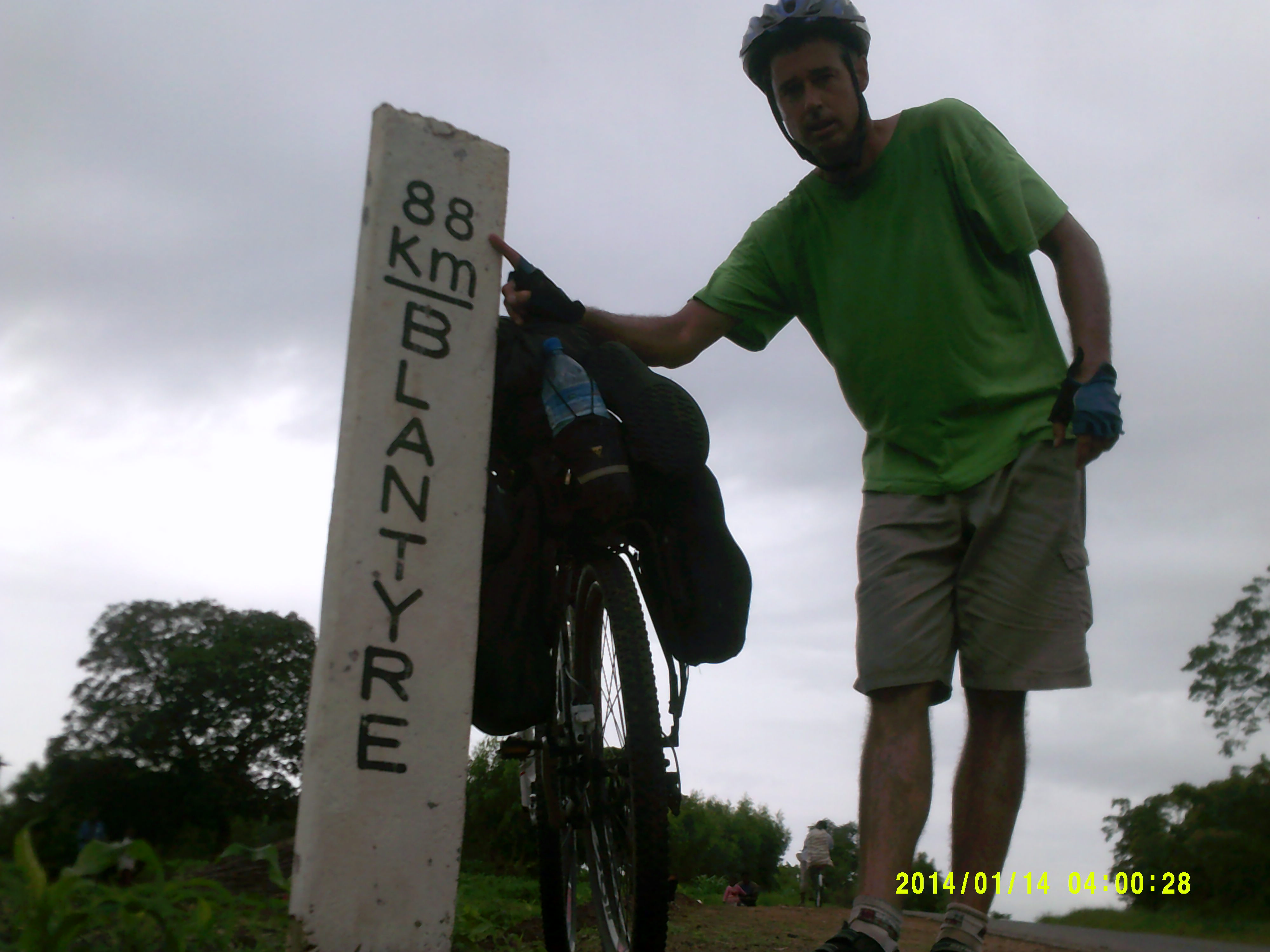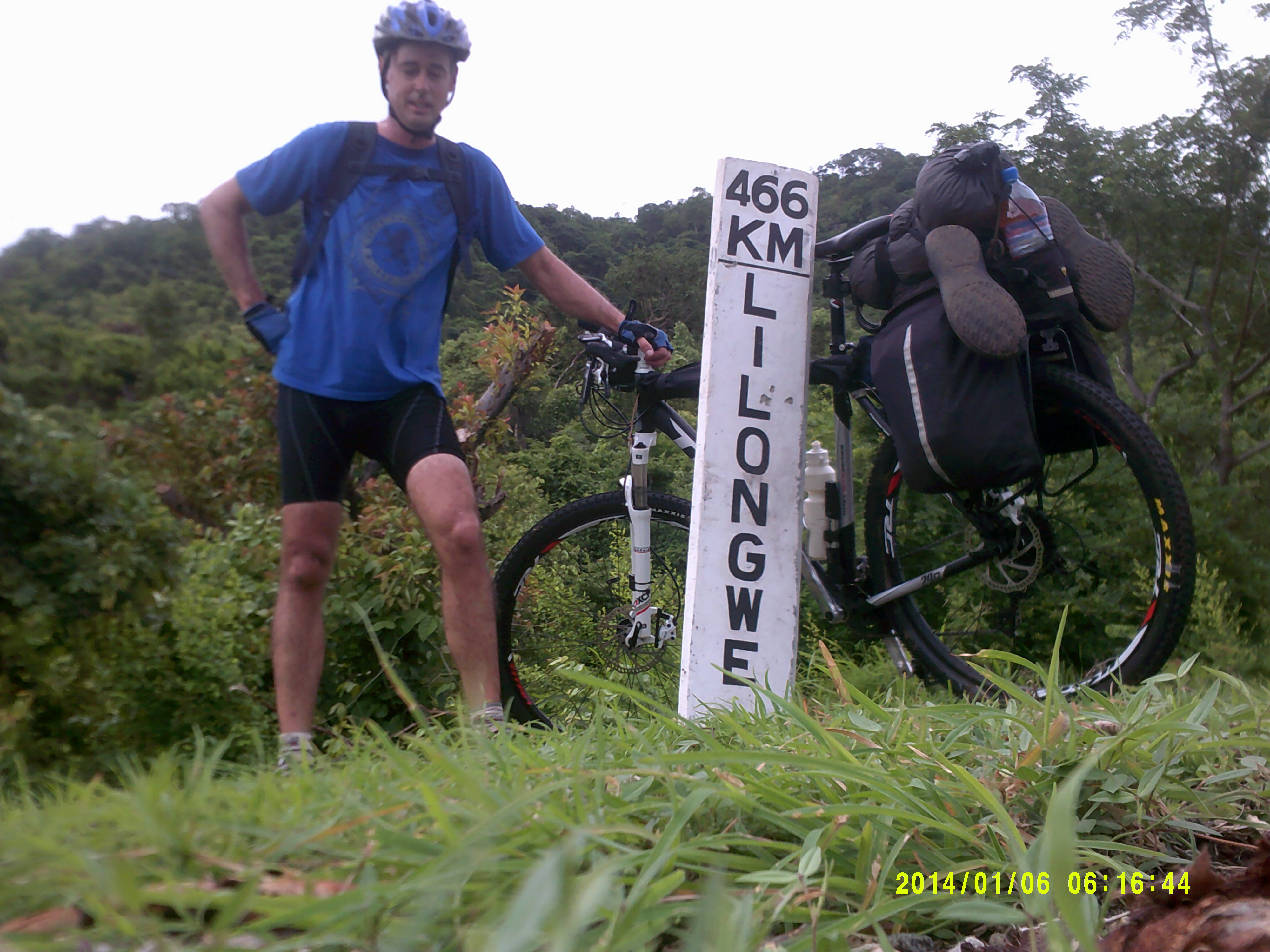 Before midday the rain came in made the sand a little harder. The rain cooled things off nice and gave me an extra boost. This was 36 km from the tar at Dondo. The rain got heavier and heavier. Then passed a village where I could see a vehicle coming from the back. It took some kilometres to get to me. When it over took me it was a pick up full of people on the back. They all laughed at me. Not far down the road I over took it, then there was some comments. Few kilometres down the road it over took again, this time they shouted what sounded like motivation. All the time the rain was coming down and rivers of water were coming down the road. I rode in the shallow rivers so as to get the compacted sand under my wheels. Not far down the road I overtook them again this time they were calling me a machine. Then they over took me again where on they passed comments of respect. All of this racing I was doing with the pickup was to help me to keep up a good pace. Otherwise the rain and road conditions would have started to wear me down. Finally after about ten kilometre of this I could not ride anymore as the wheels were sinking into the mud deeper than the rims on the wheels. The road had become a river bed. My bicycle chain had so much mud on it, you could just feel it grinding. At this point I was twelve kilometre from the tar at Dondo.