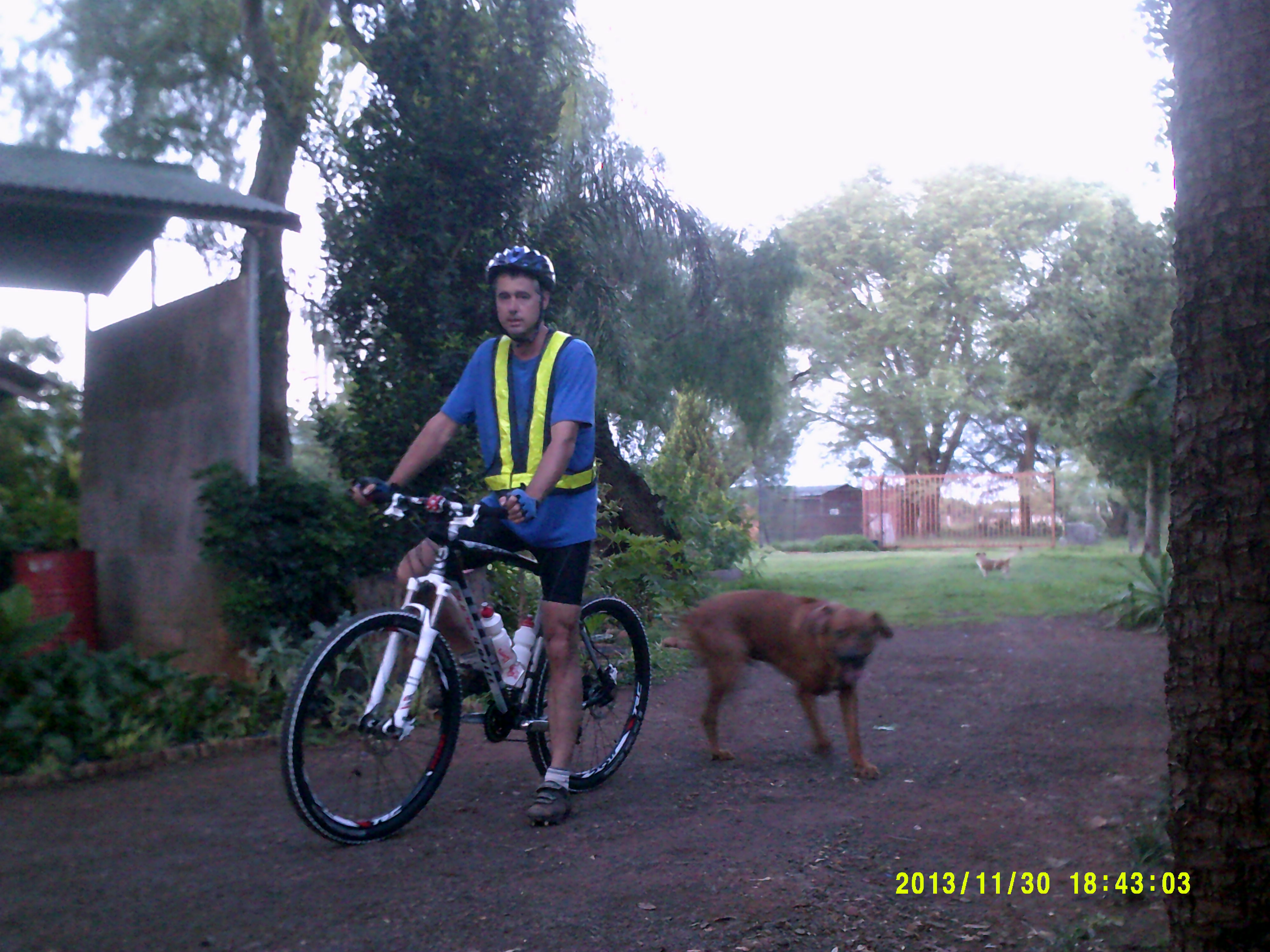 Saturday 30/11/2013 I went to collect my new bicycle. A new Titan sport 29er size XL. Had my cleats moved over from my old Mongoose. Put some bar ends on. Moved cycle computer over. Mounted two bottle holders and my pump. By this time it was dusk and was fixed on taking it for its maiden voyage. Got geared up and took the photo.