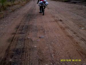 Before midday the rain came in made the sand a little harder. The rain cooled things off nice and gave me an extra boost. This was 36 km from the tar at Dondo. The rain got heavier and heavier. Then passed a village where I could see a vehicle coming from the back. It took some kilometres to get to me. When it over took me it was a pick up full of people on the back. They all laughed at me. Not far down the road I over took it, then there was some comments. Few kilometres down the road it over took again, this time they shouted what sounded like motivation. All the time the rain was coming down and rivers of water were coming down the road. I rode in the shallow rivers so as to get the compacted sand under my wheels. Not far down the road I overtook them again this time they were calling me a machine. Then they over took me again where on they passed comments of respect. All of this racing I was doing with the pickup was to help me to keep up a good pace. Otherwise the rain and road conditions would have started to wear me down. Finally after about ten kilometre of this I could not ride anymore as the wheels were sinking into the mud deeper than the rims on the wheels. The road had become a river bed. My bicycle chain had so much mud on it, you could just feel it grinding. At this point I was twelve kilometre from the tar at Dondo.