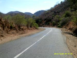 Well very nice new road that runs east parallel to a mountain.  After 12 km there was no turning, 20 km still no turning, after 30 km also no turning. Eventually my water run out as it was very hot. Just when I thought I could go no more, I saw a man on a bicycle. So I knew there was a village coming up. At the village there was a road block and I was just waved through. I stopped to ask directions to Estima. That village had water from a fridge, in this heat it is like gold. Nobody spoke English at this village. Point bicycle and say Harare and Mucumbura. People gathered in amazement and heard Harare echoing through the village.