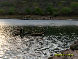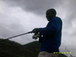 Woke up early at about five in the morning to rain on the tent. Thought the fishing trip was going to be cancelled. However Voter my boat captain was not worried. He just looks at the waves and wind. When it rains here in the summer it is just a pleasure to get wet. So off we went to the boat. All the guides were very helpful to set the boat up and help him with petrol and to pack the boat. Then one hopped into the boat to go with. So Voter said no, don’t they have guests to take. Turns out it is very quiet and no guests. So he let him come with. Good thing as he knows all the fishing spots and how to work the dam in the gorges. Was not long and he said pull up to one of the fishermen in their dugouts. He did some bartering and got a small Tiger fish, in exchange for some fish hooks.