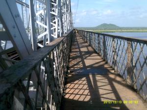 I walked down the railway line to the bridge where there was a flight of stairs to climb. The walkway was very busy. People with bowls of mangoes on their heads. Motor bikes and bicycles all went up and down the stairs. Then there were the holes in the walkway floor. This is where the concrete slabs have broken. Then there was just a piece of steel off cut thrown over the gap. To prevent the bicycles or motor bikes falling in the gap. Even people would have to watch their step. I tried to ride across however there were some places I did not trust myself. I pushed my bicycle across some sections where there was not much walkway to pass over. People were friendly and willing to give way to anybody who was in more of a hurry than they were. No matter in which direction they were traveling.